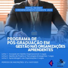 O Programa de Pós-Graduação em Gestão nas Organizações Aprendentes (PPGOA), de acordo com a Resolução nº 01/2021 /PPGOA/CE/UFPB, que define os critérios para credenciamento, recredenciamento interno e descredenciamento de docentes no âmbito do PPGOA/CE/UFPB, torna pública, por meio de comissão nomeada pela PORTARIA/PPGOA/CE-CCSA/UFPB/N°03/2023 a abertura de processo de credenciamento, recredenciamento interno e descredenciamento de docentes do Programa para professor do quadro permanente no PPGOA, para as linhas de pesquisa: