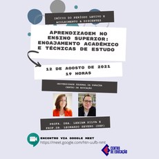 No dia 12/08, às 19h00, acontecerá a mesa intitulada APRENDIZAGEM NO ENSINO SUPERIOR: ENGAJAMENTO ACADÊMICO E TÉCNICAS DE ESTUDO.
