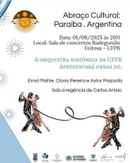 A OSUFPB será a grande atração de abertura do evento “Abraço Cultural entre Paraíba e Argentina”, que acontece entre os dias 01 e 03 de agosto, aqui em João Pessoa. O concerto, que marca o início deste evento, será realizado nesta sexta-feira, 01 de agosto, às 20h00, na Sala de Concertos Radegundis Feitosa, no Campus I da UFPB. A entrada é gratuita, respeitando rigorosamente a ordem de chegada até o limite de capacidade da Sala.