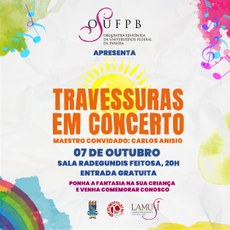 “Travessuras Em Concerto” é o nome do concerto da OSUFPB desta semana, que será realizado nesta sexta-feira, dia 07 de outubro, às 20:00 horas, na Sala de concertos Radegundis Feitosa, que fica no Campus I da UFPB. Este, que é o décimo sexto concerto da temporada 2022, é totalmente dedicado ao público infanto-juvenil em comemoração ao dia das crianças. A entrada é gratuita e aberta para todas as idades.