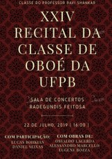 Acontece nesta segunda-feira, 22 de julho, às 16:00 horas, o XXIV Recital da Classe de Oboé da UFPB, orientada pelo professor Ravi Shankar. O recital será realizado na Sala de Concerto Radegundis Feitosa e conta com a a participação especial dos pianistas Edmilson Falcão, Daniel Seixas e Lucas Bojikian.