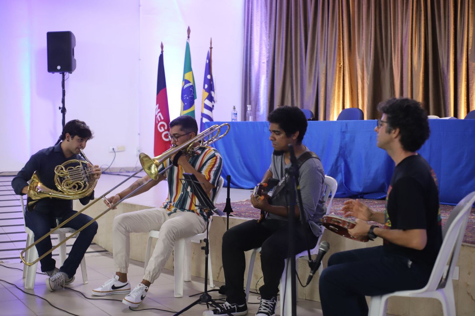 Os novos servidores da UFPB, seus amigos e familiares lotaram o auditório da Reitoria, no Campus de João Pessoa, e foram recepcionados com uma apresentação da Pequena Orquestra Popular (POP), composta pelos músicos André Rodrigues (trompa), Daniel Lima (Trombone), Diego Rafael (violão) e Chico Santana (pandeiro), que encantou a plateia com versões instrumentais de famosas músicas da MPB.