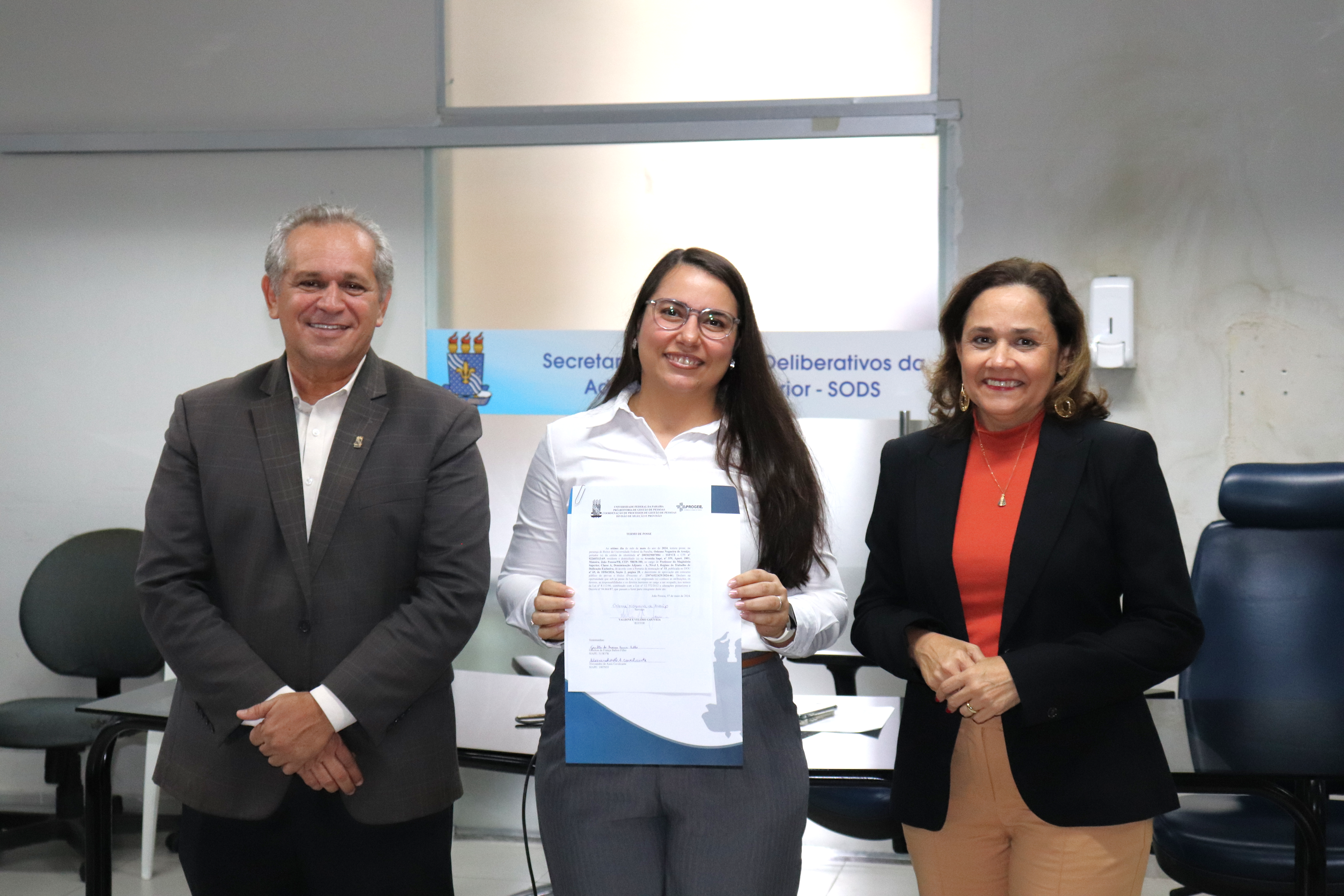 A solenidade ocorreu na sala de reuniões da Secretaria dos Órgãos Deliberativos da Administração Superior (SODS) e contou com a presença da Pró-reitora de Gestão de Pessoas (Progep), Profa. Rita de Cássia Pereira, e da Diretora da Divisão de Seleção e Provisão (DSP) do órgão, Lara Nóbrega. Amigos e familiares também compareceram às boas-vindas realizadas pela UFPB e, entre eles, a senhora Eulália Leurquin, uma das mais entusiasmadas, por causa da conquista do filho.
