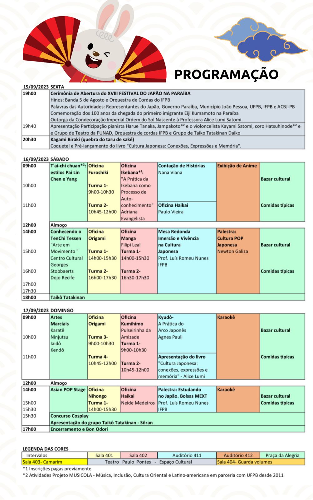No sábado e no domingo (16 e 17), o Festival chega ao CCHLA, onde diversos espaços deste Centro recebem palestras, oficinas, mesas-redondas, contações de histórias, exibição de animes e até um karaokê. A participação nestas ações ocorre mediante prévio pagamento de taxa pela plataforma Sympla.